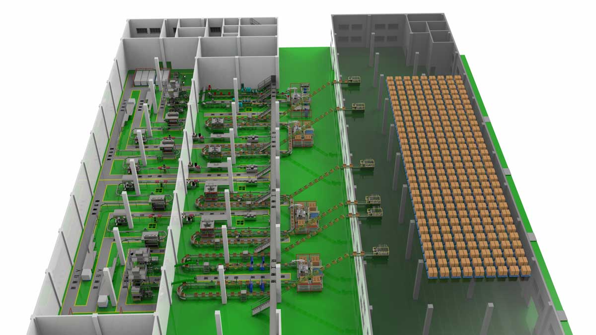 優點:整線自動化程度較高,只需4-5人進行包材供應,流水線巡視即可,碼垛完成后的成品通過AGV小車自動送到倉庫的指定位置,實現產存一體化,設備帶有數據傳輸接口,可與工廠MES系統對接;節省有限空間,合理布局美觀大方,人性化設計,實用;整線模塊化設計,可實現快速換產。